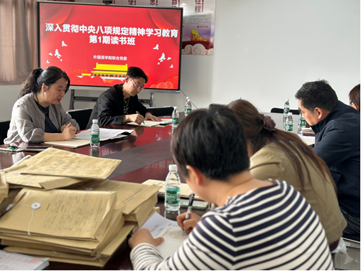 为持续加强党的作风建设,进一步贯彻落实中央八项规定精神,4月7日下午,外国语学院党委于承基楼608室精心组织开展了深入贯彻中央八项规定精神学习教育第一期读书班活动。学院中层干部、党支部书记、组织员等关键岗位人员齐聚一堂,共同参与此次意义深远的学习活动,党委书记池丽霞同志担任本次会议主持。